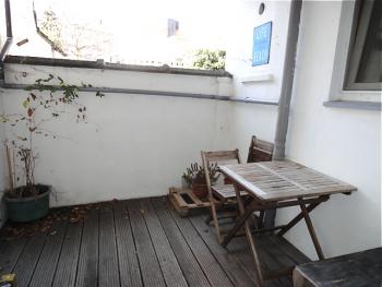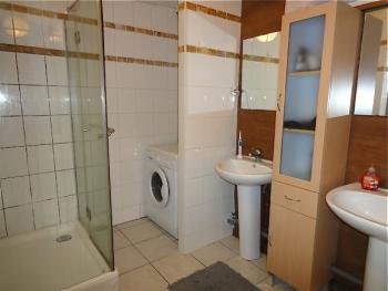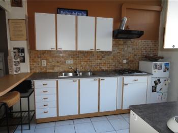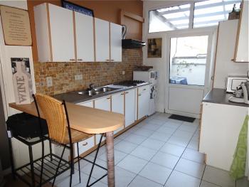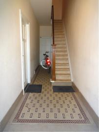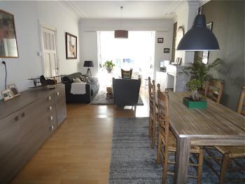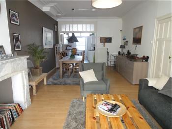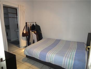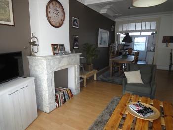 Living op laminaat met prachtige authentieke marmer schouw, open keuken op tegels met gaskookplaat en afzuigkap. Achter de keuken die ligt een soort ingesloten terras op bankirai, 1 slaapkamer op tegels met aansluitend de badkamer met douche, dubbele lavabo en toilet.